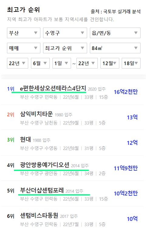 수영구에 위치한 아파트들의 실거래가 현황입니다. 재건축 아파트는 별개로 하고, 그나마 신축 아파트들의 전용84타입의 실거래가 현황을 보면, 10억~16.2억 사이에 거래됐었네요. 물론, 아파트 별로 입지와 브랜드 차이는 있습니다.