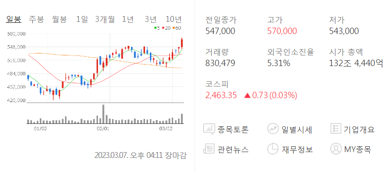 SK이노베이션도 낙폭이 크지만, 최근 몇일 상승폭이 굉장히 가파릅니다. 오늘 23. 3. 07. 하루 5% 이상의 상승을 보여주고 있습니다.
